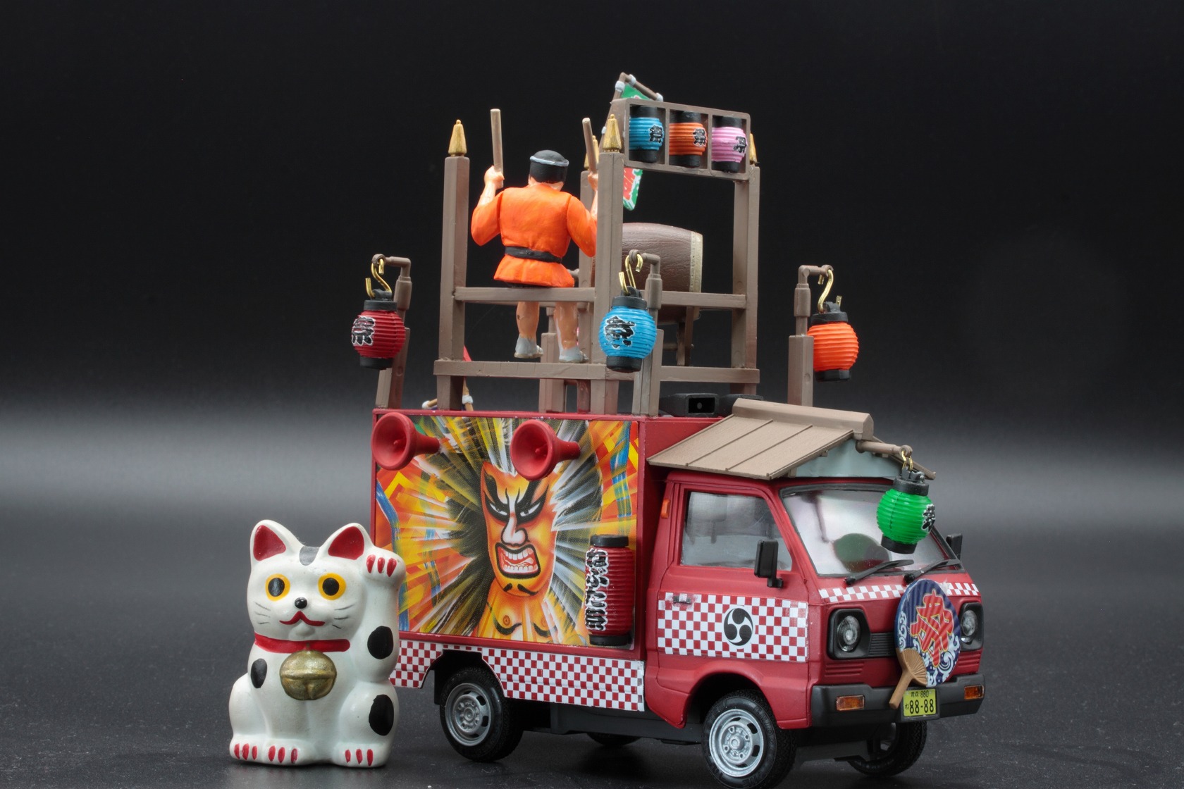 ムラの無い、さすがの塗装ですね。 情報量が多くて 楽しいです。移動販売車で、太鼓とは ねぶた入ってるし カオスかも。 ??…スピーカーシステムなの(汗