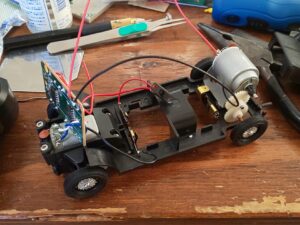 今回はモーターライズのシャーシを活かしてギヤボックス・電池ボックス・座席等そのままに、ステアリング機構を切除してソコにジョーゼンのラジコンから切り出したステアリングユニットを前後逆にして移植、その上に制御基板を配置しました😉