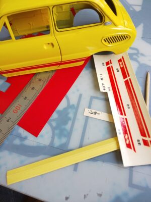 ハセガワさんのフィニッシュシートは切って貼るのでラインが綺麗に出る上に塗装より丈夫だったりするので持ったり遊んだりする作品にはもってこいです😉ルーフとサイドシルのモールにはミラーフィニッシュ、ウインカーとテールにはクリアオレンジとレッドのフィニッシュシートも使っています😚