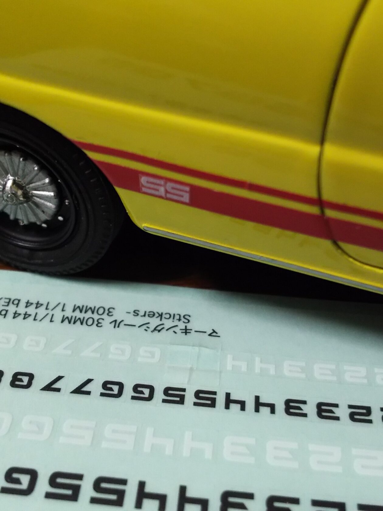 サイドの赤いデカールはやはりボロボロで、クリアコートしたら何とか貼れそうになったものの遊んでるうちに剥げそうなのでハセガワの赤色フィニッシュシートで代用し、SSの文字は30MMのシールの『5』を逆さにしてソレっぽく再現してます。
