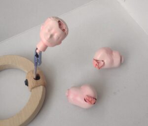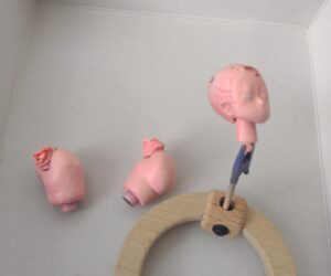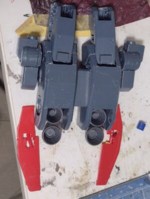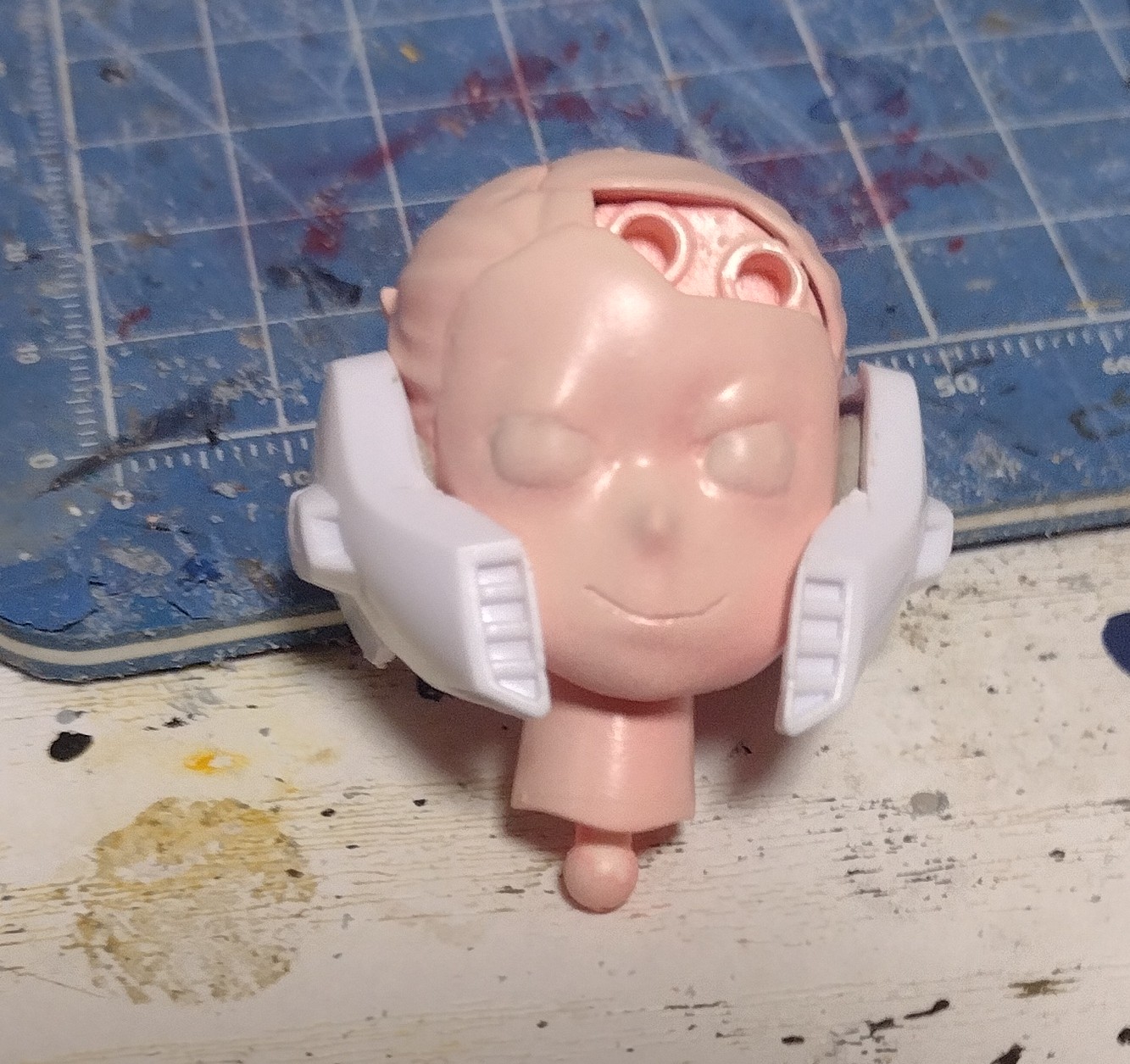 さて、顔の基本塗装 白サフ→ピンクサフ→キャラクターフレッシュ2→キャラクターフレッシュ1と、いつもの缶スプレーでやりました。ウーン⋯ワンパターンだな⋯。バックパックは強化型っぽくするため切った貼ったなどを繰り返してます。