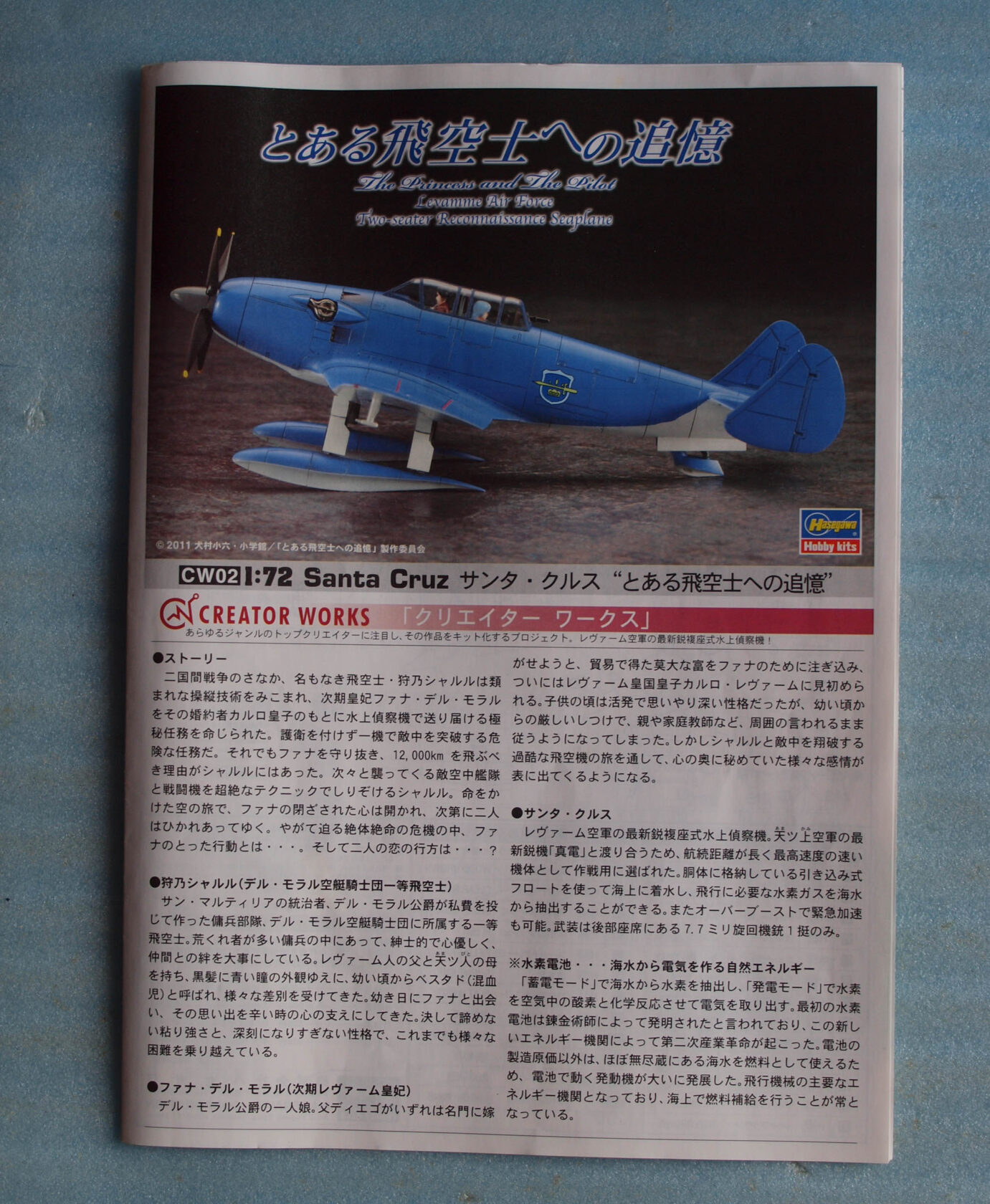 航空機 ハセガワ 1/72 サンタ・クルス号の完成挑戦 2026.04.09 タグ: 航空機 このトピックには4件の返信、3人の参加者があり、最後にロマン・スミルノフにより20時間、 50分前に更新されました。 2件の返信スレッドを表示中 投稿者 投稿 2026年4月9日 8:33 PM #12502 ロマン・スミルノフ参加者 バンダイ「SWシリーズ」のタイファイターも予定外の事が起りながらも完成出来ましたので、次回作としてアニメに出てくる偵察用水上機に挑戦したいと思います。 外箱に書かれている説明によりますと「とある飛行士への追憶」に出てくる水上機の名称がサンタ・クルスだそうです。 サンタ・クルスは複座(二人)の偵察機とあり、着水状態とスタンドによる飛行状態を選択できるとあります。 ただ、「とある飛行士への追憶」なるアニメは目にした事もなく、「とある飛行士への追憶」製作委員会なる名前も聞いた事が有りませんので、実際にアニメが存在するのかも全く不明ですが、外箱にコピーライトのマークと2011 犬村小六・小学館と、TMSの承認済のシールが貼られています。 さらに外箱には「クリエータワークス」シリーズの2番目とはありますが真偽は分りません。 Attachments: ブラボー 2026年4月10日 12:17 AM #12540 コウ参加者 ロマンさん、こんばんは ストーリー読んじゃいました。 実機のようで、ファンタジーでしたね。 「真電」とか ネーミングを史実に寄せているようです。 ( ´ -` 水素電池の機関らしいですが、スケールものとして 興味深いです。 ブラボー 2026年4月10日 8:20 AM #12545 ロマン・スミルノフ参加者 コウさん おはようさんどす。 飛行機の長谷川と往時には呼ばれていましたので、 その貫禄十分なキットと言えると思います。 スケールにしては部品点数が多くあり完成するか 聊か心配です。 長谷川には珍しくポリ部品でペラが回転するように なっていますので、こだわったシリーズだと思います。 ただ、このシリーズがどのくらいあるのかはわかりませんが、 他にあるなら見てみたい気もします。 ブラボー 2026年4月10日 1:10 AM #12542 白玉餡参加者 こんばんは、スミルノフさん! 昨日ググってみたところ凄く綺麗な青の水上機だったので エンブレムも中々に美しい~。)スミルノフさんだったらどう料理するのかな~? と思い面白そうとコメしたんですが、架空のファンタジーデザインでもある中で 自己流も大いに生きそうな素材!⸜(* ॑꒳ ॑* )⸝ 益々楽しみです~(๑ゝڡ◕๑)♬♪ ブラボー 2026年4月10日 8:28 AM #12546 ロマン・スミルノフ参加者 白玉餡さん。 おはようさんどす。 こちらはエアモデルは数えるほどしか作成した事がありませんので、 ご期待に添えるようなものにはならないだろうと思いますよ。 スケールの割には細かく小さい部品が多いですからね。 ピン!っと部品を飛ばしてしまいそうで正直少々億劫になっています。(-_-;) ブラボー 投稿者 投稿 2件の返信スレッドを表示中 このトピックに返信するにはログインが必要です。 ログイン ユーザー名: パスワード: ログイン状態を保持 ログイン